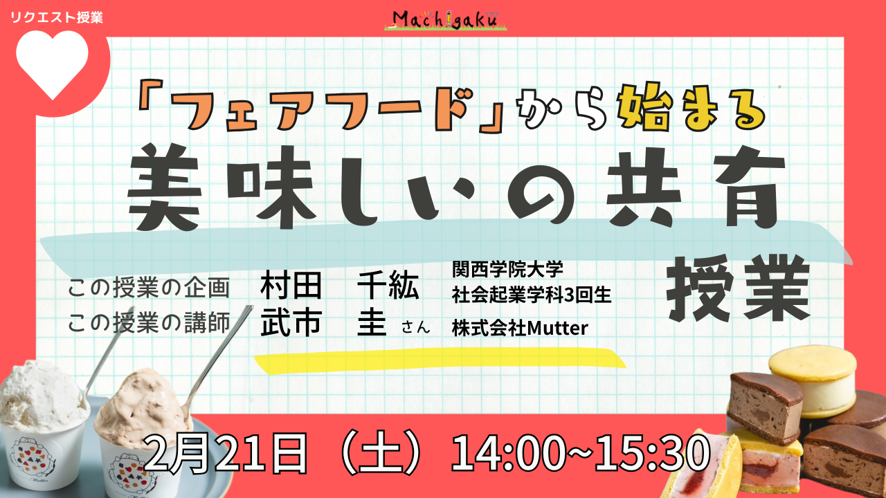 投稿日 : 2026/01/08 その他の授業 学校の中に「こんな場所あったらいいな」を考える授業 2026年1月26日(月) 18:00 - 19:30 COKOキャンパス 投稿日 : 2026/01/11 ひとの授業 【ひとの授業】髙橋 慶丞さんの巻 2026年2月8日(日) 14:00 - 16:30 西宮市市民・大学共創プラザ(ワークショップルーム) 最終更新日 : 2026/01/15 その他の授業 フェアフードから始まる美味しいの共有 2026年2月21日(土) 14:00 - 15:30 コープ西宮南店キャンパス